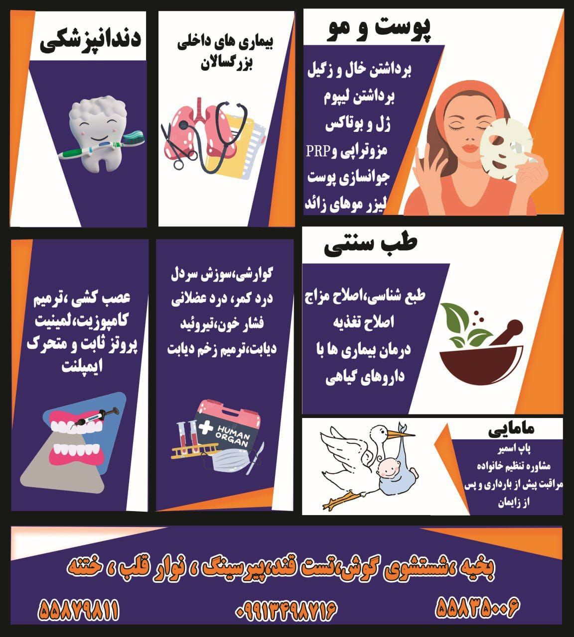 گوارشی , سوزش سر دل , درد کمر , درد عضلانی , فشار خون , تیروئید , دیابت , ترمیم زخم دیابت , بخیه , شستشوی گوش , تست قند , پیرسینگ , نوار قلب  و ختنه