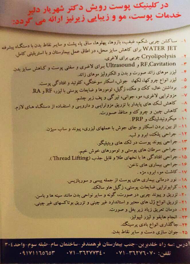فارس , شیراز , خیابان قصر دشت , سه راه خلدبرین , مجتمع سام , طبقه سوم , واحد ۴ , کد پستی ۷۱۹۳۶۶۹۴۴۳
