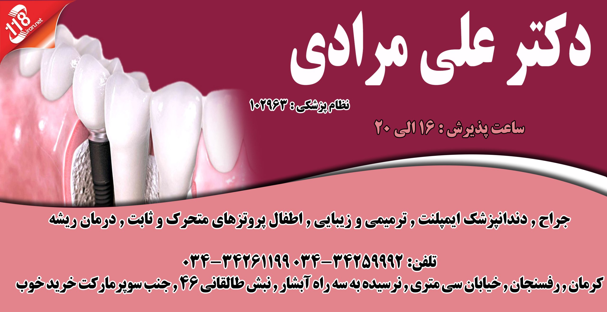 کرمان , رفسنجان , خیابان سی متری , نرسیده به سه راه آبشار , نبش طالقانی 46 , جنب سوپرمارکت خرید خوب , مطب دکتر علی مرادی