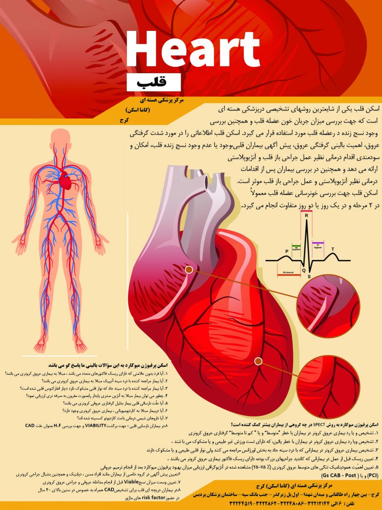 اسکن قلب یکی از شایعترین روشهای تشخیصی در پزشکی هسته ای است که جهت بررسی میزان جریان خون عضله قلب و همچنین بررسی وجود نسج زنده د رعضله قلب مورد استفاده قرار می گیرد. اسکن قلب اطلاعاتی را در مورد شدت گرفتگی عروق، اهمیت بالینی گرفتگی عروق، پیش آگهی بیماران قلبی،‌وجود یا عدم وجود نسج زنده قلب، امکان و سودمندی اقدام درمانی نظیر عمل جراحی باز قلب و آنژیوپلاستی ارائه می دهد و همچنین در بررسی بیماران پس از اقدامات درمانی نظیر آنژیوپلاستی و عمل جراحی باز قلب موثر است. اسکن قلب جهت بررسی خونرسانی عضله قلب معمولاٌ در ۲ مرحله و در یک روز یا دو روز متفاوت انجام می گیرد.