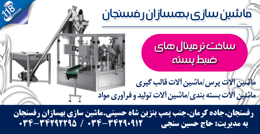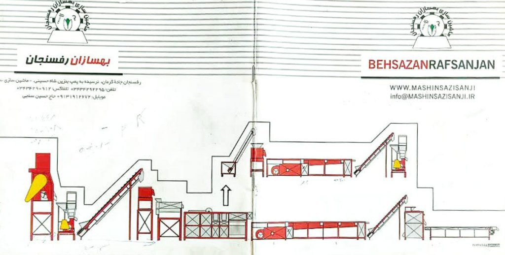یکی از تولیدکنندگان ترمینال ضبط پسته یا خط فرآوری پسته در رفسنجان میباشد که با ربع قرن تجربه کاری مفتخر است جدیدترین ماشین آلات خط فرآوری پسته را برای کشاورزان پسته کار و کارگاه های فرآوری پسته با کیفیت بالا تولید و عرضه نماید. تجهیزات و ماشین آلات فرآوری پسته یا به عبارتی دستگاه ضبط و فرآوری پسته که به ترمينال پسته نیز مشهور است در این شرکت با ظرفيت ۳ تا ۴ هزارکيلو درساعت تولید مي شود که توانایی آنرا دارد که پسته را به طور کامل تميز و خشک نماید که به تاييد وزارت بهداشت و درمان و دریافت اخذ نشان سیب سلامت بهداشت برای بسته بندی برسد.