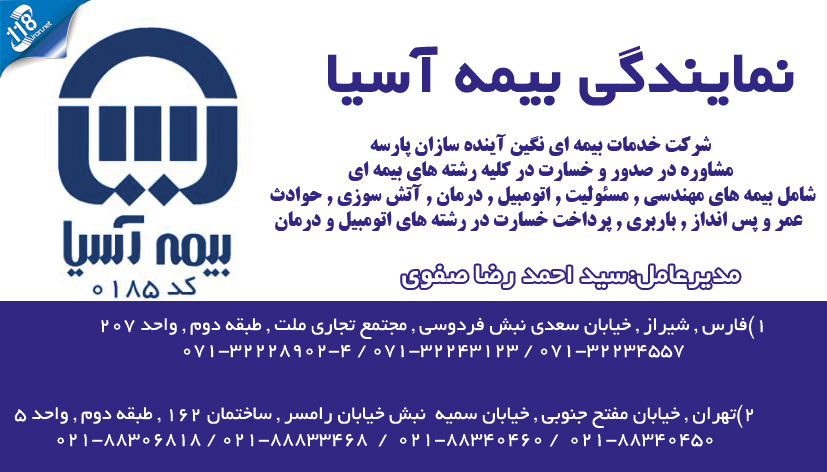 نمایندگی بیمه آسیا کد ۰۱۸۵ در شیراز