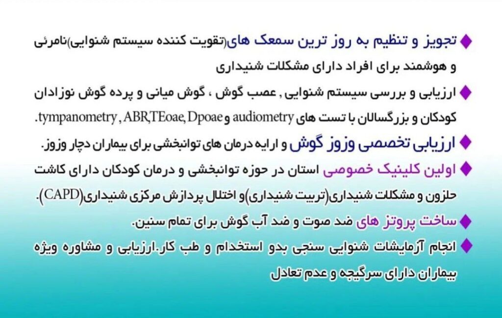 مجهز به پیشرفته ترین دستگاه های ارزیابی tympanometry و audiometry و ( TEOAE-DPOAE)