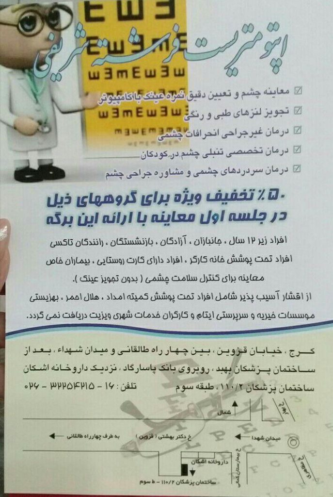 توضیحات:طرف قراداد با خانه کارگر و راهیان سلامت: پرداخت نصف ویزیت و ۱۵ تخفیف برای تهیه عینک طبی