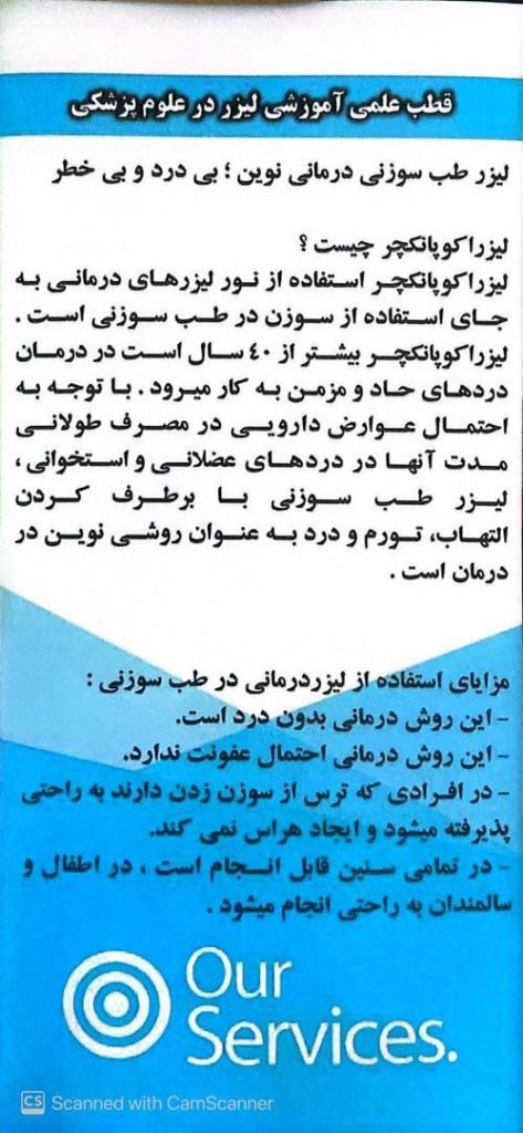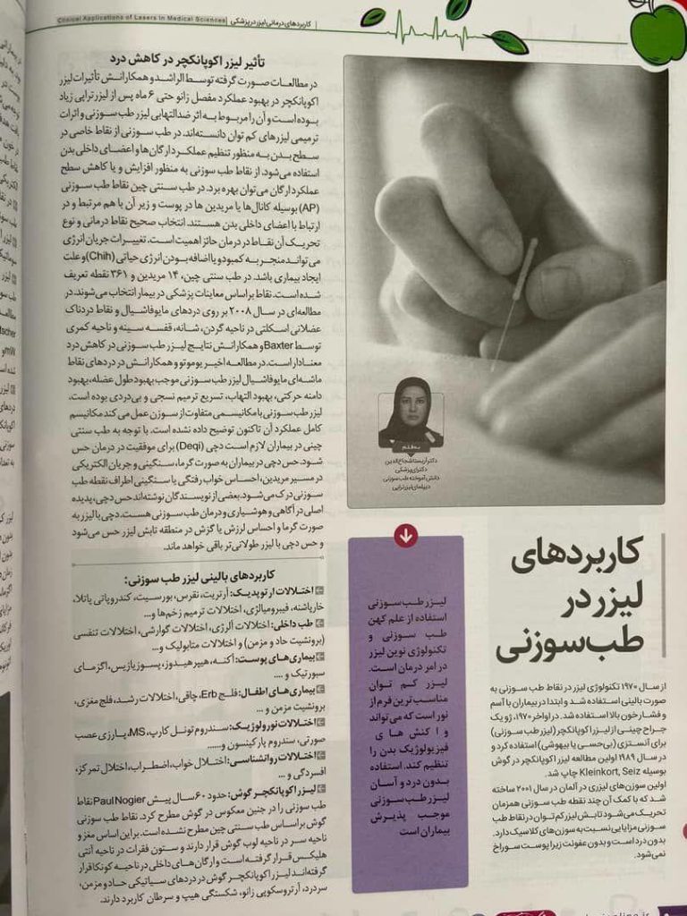 لیزرطب سوزنی بدون درد ، بدون عارضه و با اثربخشی بالا در برطرف کردن دردهای عضلانی اسکلتی ، عصبی و روان تنی میباشد .