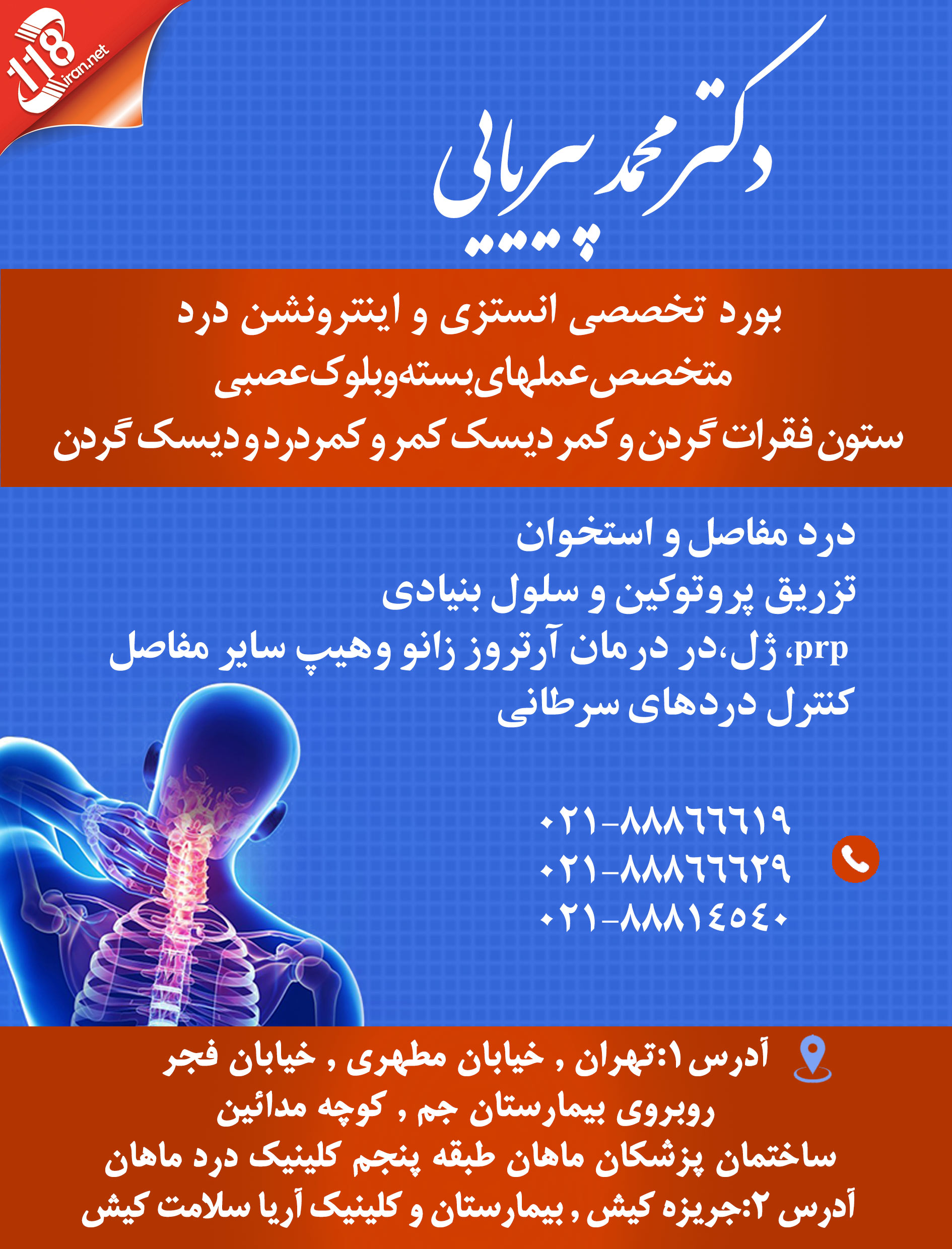 تهران , خیابان مطهری , خیابان فجر , روبروی بیمارستان جم , کوچه مدائین , ساختمان پزشکان ماهان , طبقه پنجم کلینیک درد ماهان , دکتر محمد پیریایی