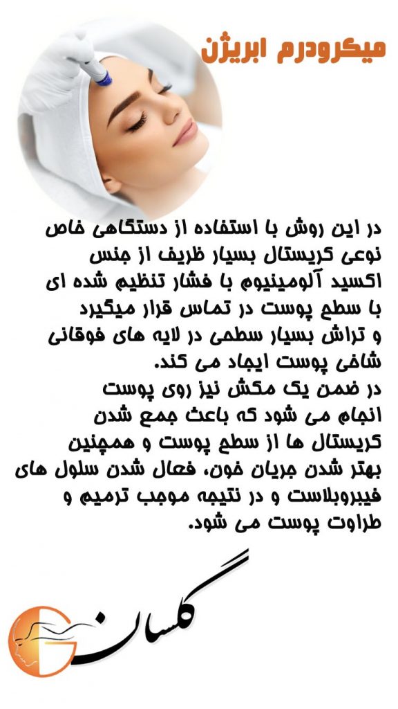 میکرودرم ابریژن یکی از سریع ترین و بدون دردترین روش های درمانی غیرتهاجمیست که برای جوانسازی پوست به کار گرفته می شود.دراین روش کل پوست را در معرض تماس با يک ماده معدنی بی ضرر که همان پودر اکسيد آلومينيوم می باشد قرار می دهند که اين پودر با داشتن کريستال های ريز باعث مي شود که پوست ساييده شده و بافت های مرده از بين رفته و ترميم پوست فعال گردد.
