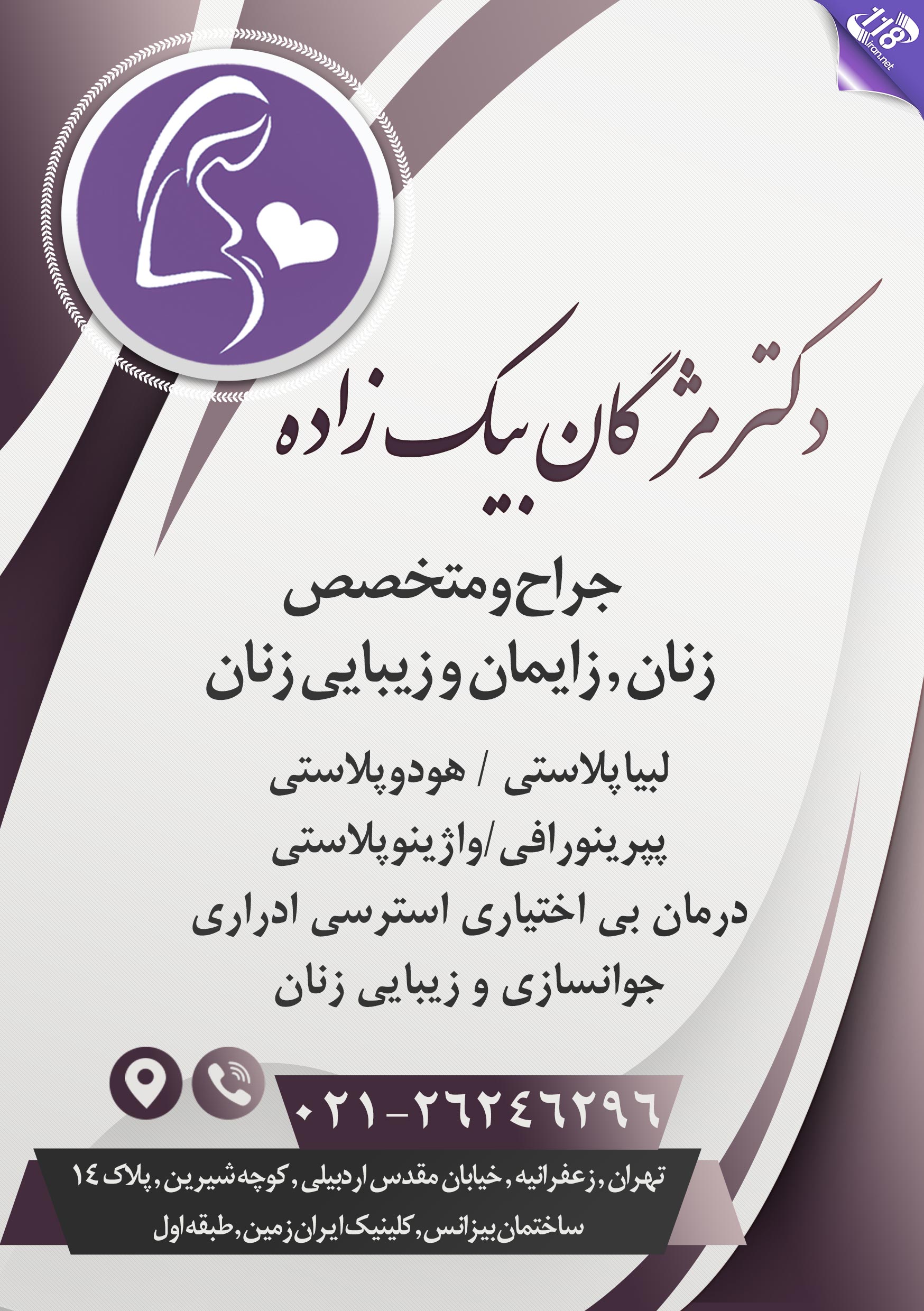 مطب ) تهران , زعفرانیه , خیابان مقدس اردبیلی , کوچه شیرین , پلاک 14 , ساختمان بیزانس , کلینیک ایران زمین , طبقه اول