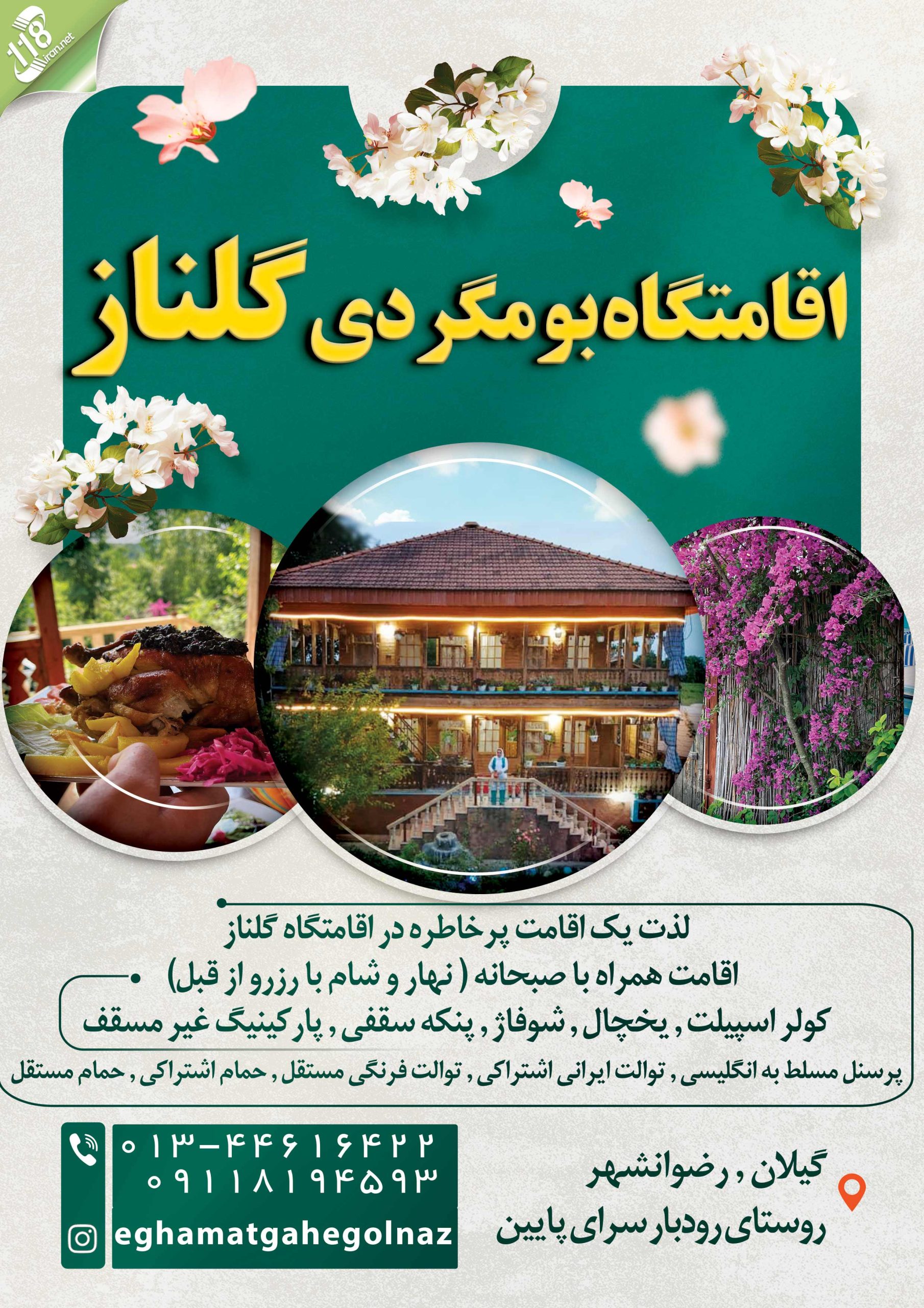 اقامتگاه بوم گردی گلناز در استان گیلان، شهرستان رضوانشهر، روستای رودبار سرای پایین، خیابان امیر کبیر واقع شده است و آماده پذیرایی از گردشگران و مسافران عزیز می باشد.
