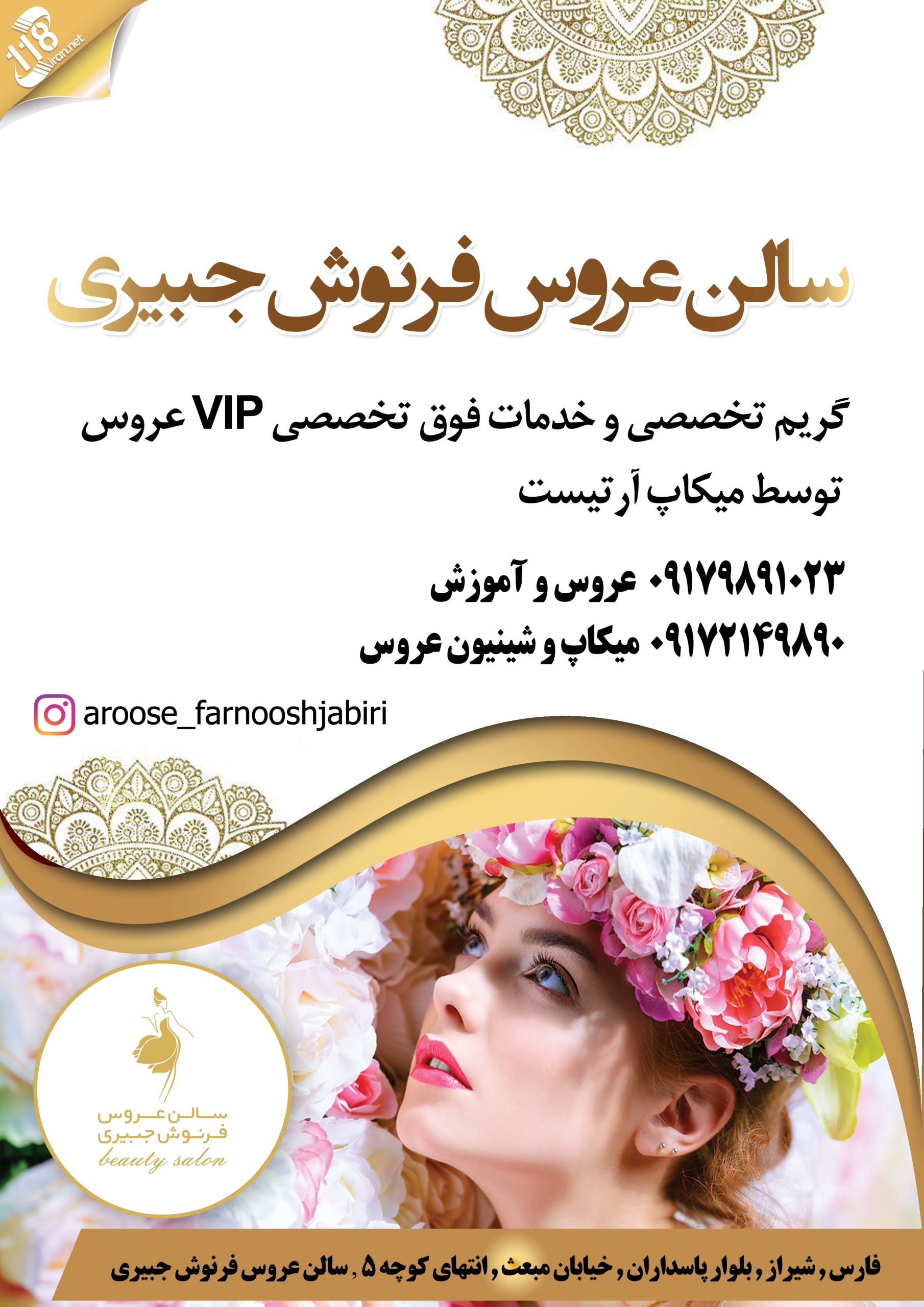 در سالن VIP عروس فرنوش جبیری با خدمات ذیل پذیرای شما عزیزان میباشیم:میکاپ و شینیون , جدیدترین میکاپ و شنیون های ویژه عقد , نامزدی , حنابندان و همراه عروس به صورت لایت و ژورنالیانواع رنگ و لایت : لایت هندسی , گردشی , ریمبو , پایروت , لایت و سامبر , بلیچ , کراتین سرد و گرم , امبر , صافی ژاپنی و پرلایت