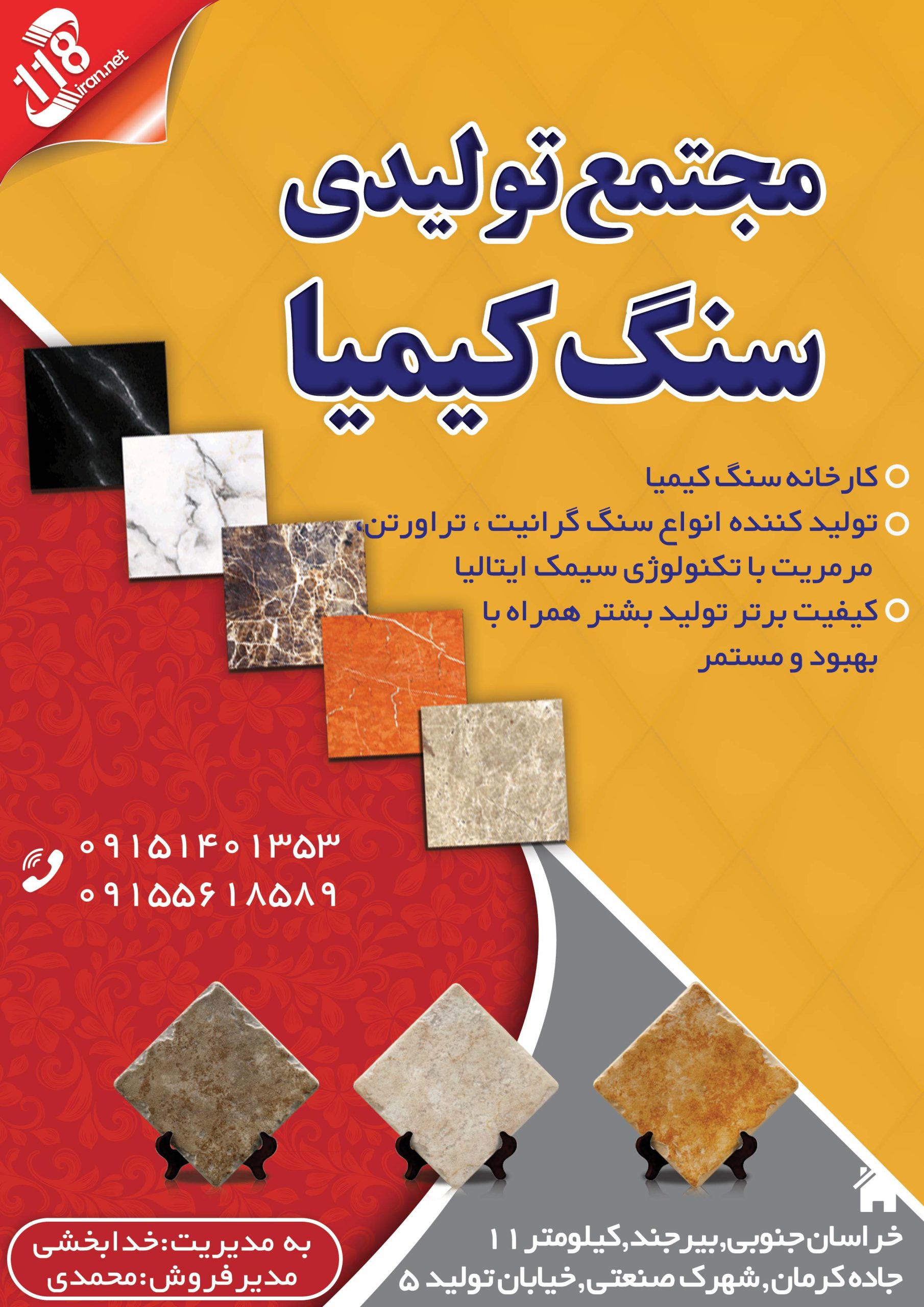 خراسان جنوبی , بیرجند , کیلومتر ۱۱ جاده کرمان , شهرک صنعتی , خیابان تولید ۵ , مجتمع تولیدی سنگ کیمیا