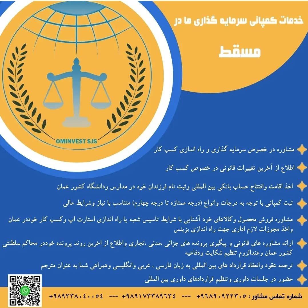 قبول وکالت در پرونده های حقوقی , کیفری , جزایی , چک , مواد مخدر , جعل و تزویر مدنی , تجاری و شرکت ها , خانواده , کار و کارفرما , وزارع عمل و قوای عامله , تنظیم قراردادهای تجاری و کاری , ثبت شرکت , اخذ اقامت و مشاوره سرمایه گذاری در کشور عمان