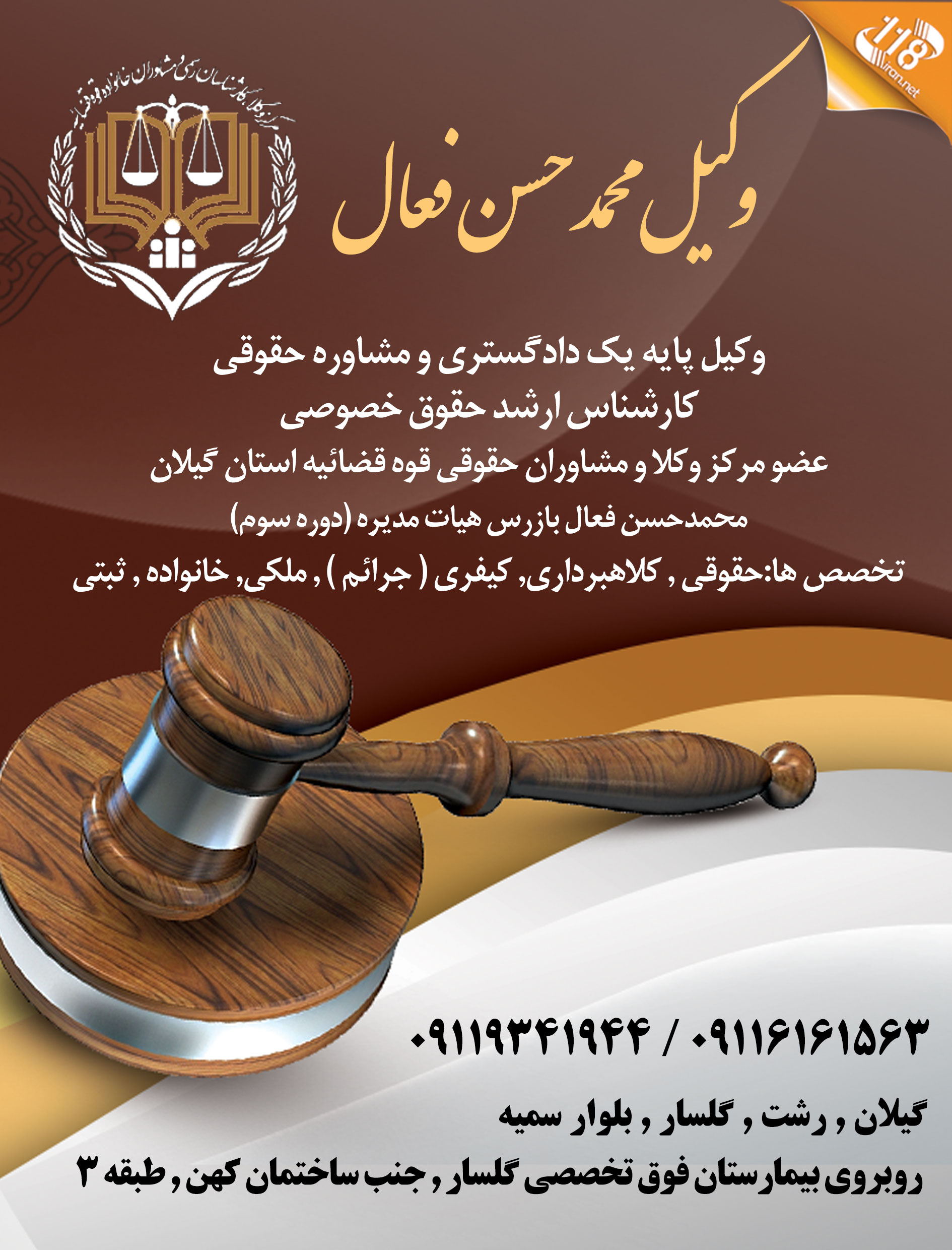 آقای محمدحسن فعال، یکی از بهترین وکلای پایه دادگستری در شهر رشت می باشد، ایشان با بیش از ۱۸ سال سابقه درخشان در کلیه پرونده های حقوقی و غیره به طور تخصصی فعالیت می کند.