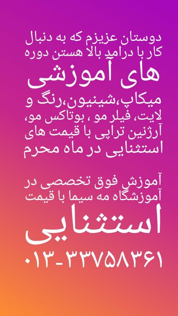 فقط میتونم بگم خوش شانس بودم که با مجموعه حرفه ای مه سیما اشنا شدم و دوره رنگ و لایت و رو در محضر خانم الهوردی و خانم راد گذروندم که حرفه ای بودنشون رو با مهربانی رنگی دیگر بخشیدند اگر دنبال جایی هستین که می خواین در محیط سالم، پویا و حرفه ای اموزش ببینید قطعا اموزشگاه مه سیما جایی که میتونید همه رو یه جا به دست بیارید خوشحالم که باز هم در خدمت شما هستم در لاین کوتاهی و دوره تخصصی رنگ و لایت و بازم فرصت اینو دارم که از شما عزیزان بیاموزم