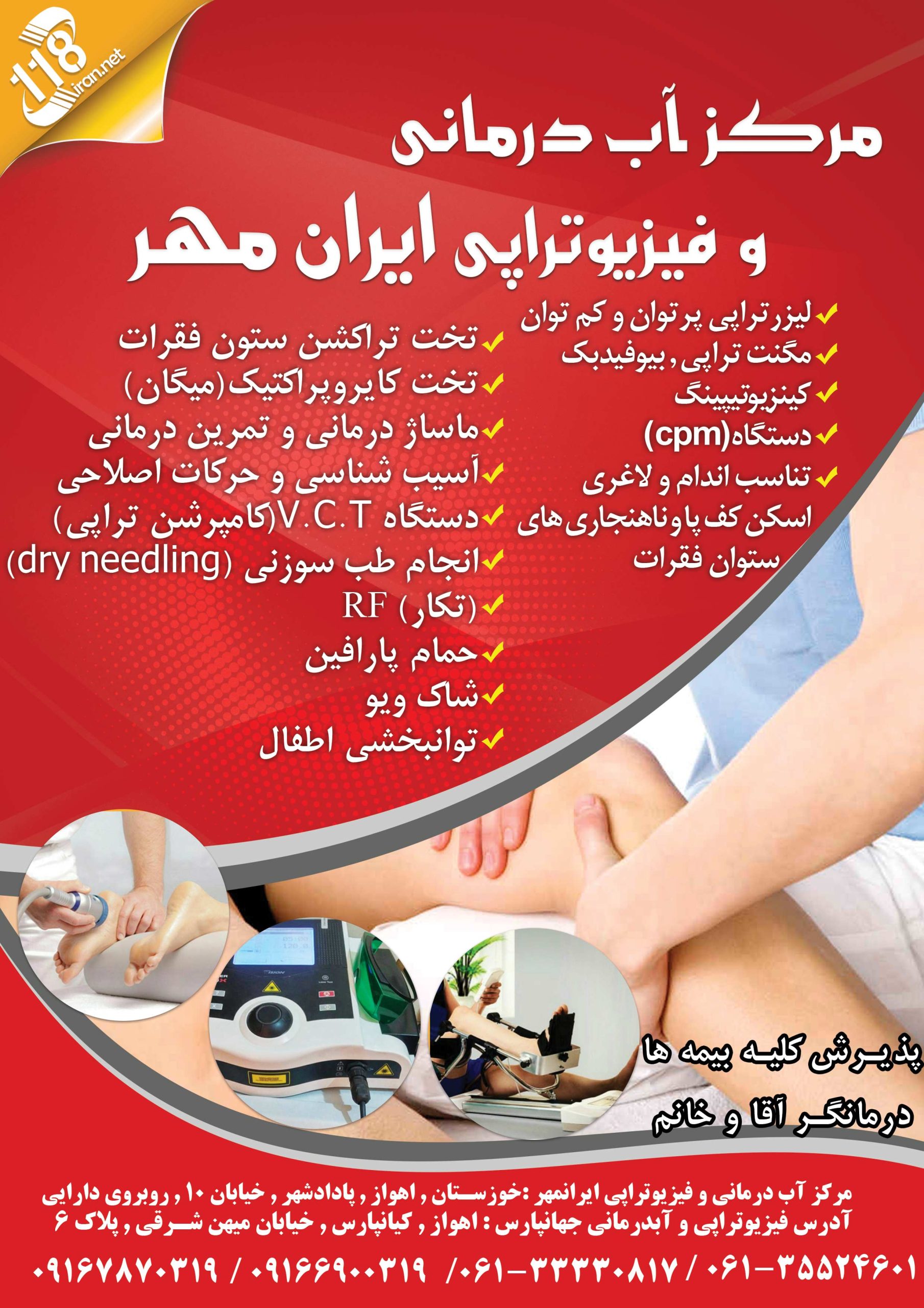 ۱ )مرکز آب درمانی و فیزیوتراپی ایرانمهر : خوزستان , اهواز , پادادشهر , خیابان 10 , روبروی دارایی