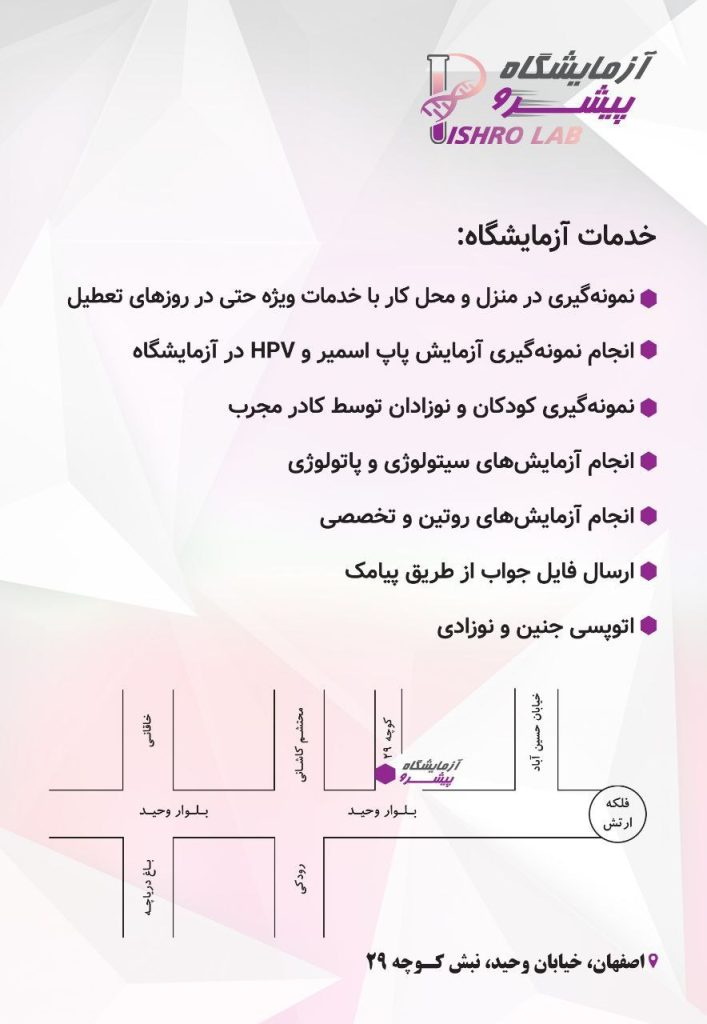 نمونهگیری در منزل و محل کار با خدمات ویژه حتی در روزهای تعطیل انجام نمونهگیری آزمایش پاپ اسمیر و HPV در آزمایشگاه نمونهگیری کودکان و نوزادان توسط کادر مجرب انجام آزمایشهای سیتولوژی و پاتولوژی انجام آزمایشهای روتین و تخصصی ارسال فایل جواب از طریق پیامک اتوپسی جنین و نوزادی
