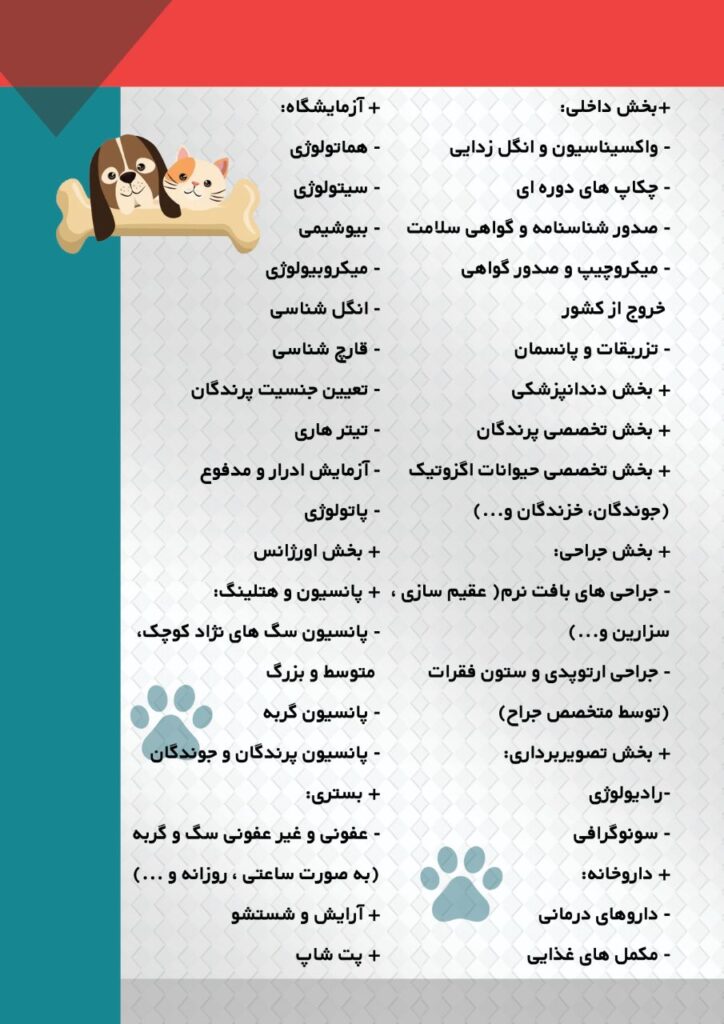+بخش جراحی: -جراحی های بافت نرم( عقیم سازی ، سزارین و…)-جراحی ارتوپدی و ستون فقرات (توسط متخصص جراح)