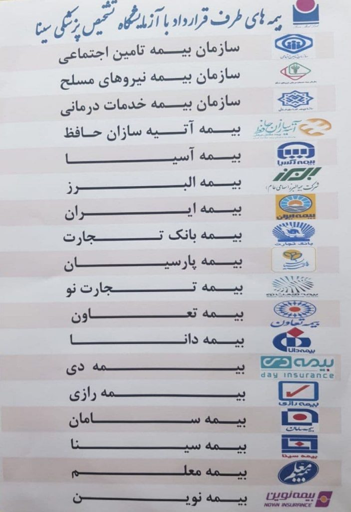 طرف قرارداد با بیمه های تکمیلی: تامین اجتماعی ,خدمات درمانی , ارتش , آتیه , آسیا , البرز ,ایران,آرمان سفیران,آرمان ,پارسیان ,تجارت نو ,تعاون ,دانا ,دی ,رازی ,سامان,سرمد ,سینا,کوثر,ما,معلم ,ملت ,نوین ,کمک رسان sos, میهنطرف قرارداد با بیمه های :