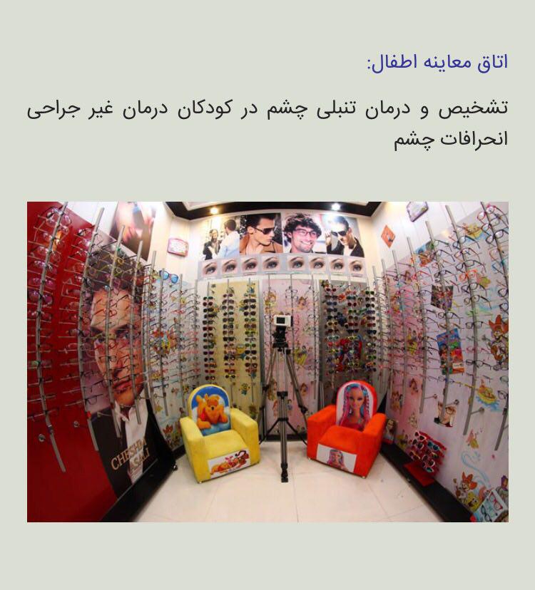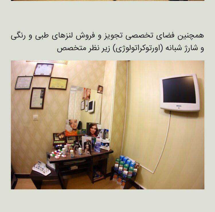 همچنین فضای تخصصی تجویز و فروش لنزهای طبی و رنگی وشارژ شبانه (اورتوکراتولوژی) زیر نظر متخصص